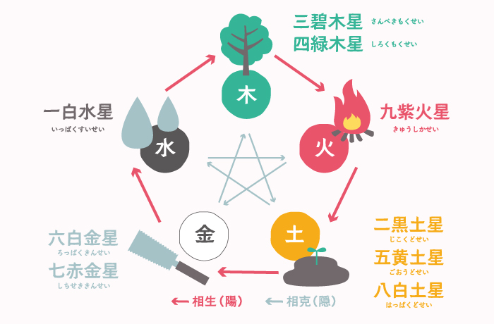生年月日から人の誕生の影響を次の九種類に配しており「東洋占星術」とも呼ばれ、九星の木星、火星、土星、金星、水星は天体の惑星ではなく易の八卦から来るものです。